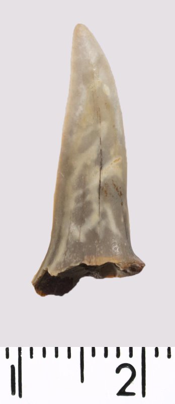 Зуб (фрагмент). Акула. Scapanorhynchus gigas Woodward 1889. Классификация: Хордовые Chordata, Позвоночные Vertebrata, Хрящевые рыбы Chondrichthyes, Пластиножаберные Elasmobranchii