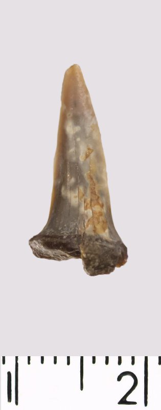 Зуб (фрагмент). Акула. Scapanorhynchus gigas Woodward 1889. Классификация: Хордовые Chordata, Позвоночные Vertebrata, Хрящевые рыбы Chondrichthyes, Пластиножаберные Elasmobranchii