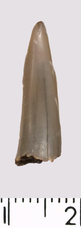 Зуб (фрагмент). Акула. Scapanorhynchus gigas Woodward 1889. Классификация: Хордовые Chordata, Позвоночные Vertebrata, Хрящевые рыбы Chondrichthyes, Пластиножаберные Elasmobranchii