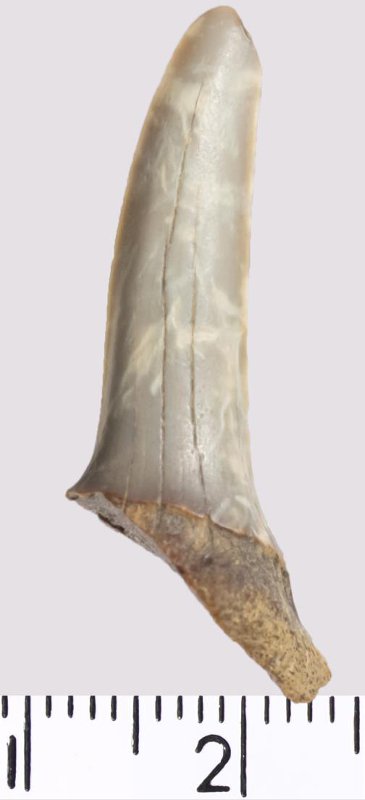 Зуб (фрагмент). Акула. Scapanorhynchus gigas Woodward 1889. Классификация: Хордовые Chordata, Позвоночные Vertebrata, Хрящевые рыбы Chondrichthyes, Пластиножаберные Elasmobranchii