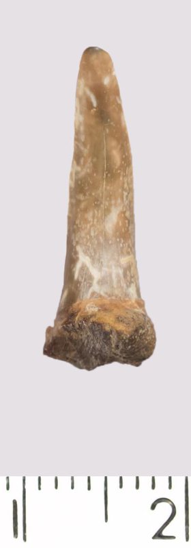 Зуб (фрагмент). Акула. Scapanorhynchus gigas Woodward 1889. Классификация: Хордовые Chordata, Позвоночные Vertebrata, Хрящевые рыбы Chondrichthyes, Пластиножаберные Elasmobranchii