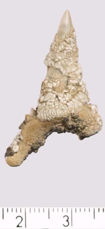 Зуб. Акула. Scapanorhynchus gigas Woodward 1889. Классификация: Хордовые Chordata, Позвоночные Vertebrata, Хрящевые рыбы Chondrichthyes, Пластиножаберные Elasmobranchii