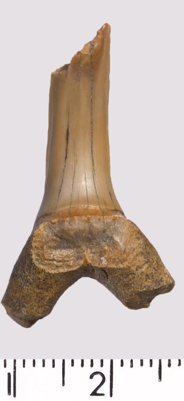 Зуб. Акула. Scapanorhynchus gigas Woodward 1889. Классификация: Хордовые Chordata, Позвоночные Vertebrata, Хрящевые рыбы Chondrichthyes, Пластиножаберные Elasmobranchii