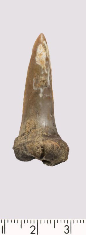 Зуб (фрагмент). Акула. Scapanorhynchus gigas Woodward 1889. Классификация: Хордовые Chordata, Позвоночные Vertebrata, Хрящевые рыбы Chondrichthyes, Пластиножаберные Elasmobranchii
