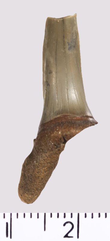 Зуб. Акула. Scapanorhynchus gigas Woodward 1889. Классификация: Хордовые Chordata, Позвоночные Vertebrata, Хрящевые рыбы Chondrichthyes, Пластиножаберные Elasmobranchii