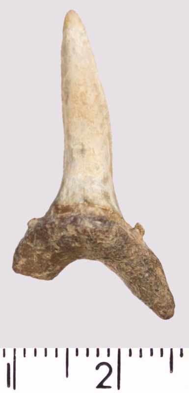 Зуб. Акула. Scapanorhynchus gigas Woodward 1889. Классификация: Хордовые Chordata, Позвоночные Vertebrata, Хрящевые рыбы Chondrichthyes, Пластиножаберные Elasmobranchii