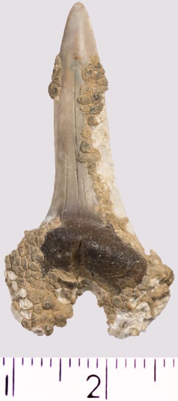 Зуб. Акула. Scapanorhynchus gigas Woodward 1889. Классификация: Хордовые Chordata, Позвоночные Vertebrata, Хрящевые рыбы Chondrichthyes, Пластиножаберные Elasmobranchii