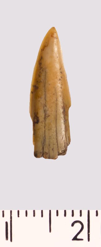 Зуб (фрагмент). Акула. Scapanorhynchus gigas Woodward 1889. Классификация: Хордовые Chordata, Позвоночные Vertebrata, Хрящевые рыбы Chondrichthyes, Пластиножаберные Elasmobranchii