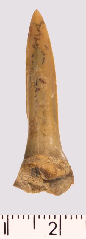 Зуб (фрагмент). Акула. Scapanorhynchus gigas Woodward 1889. Классификация: Хордовые Chordata, Позвоночные Vertebrata, Хрящевые рыбы Chondrichthyes, Пластиножаберные Elasmobranchii