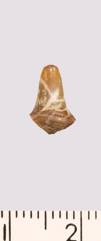 Зуб (фрагмент). Акула. Odontaspis macrorhiza (Cope) Leriche, 1902. Классификация: Хордовые Chordata, Позвоночные Vertebrata, Хрящевые рыбы Chondrichthyes, Пластиножаберные Elasmobranchii