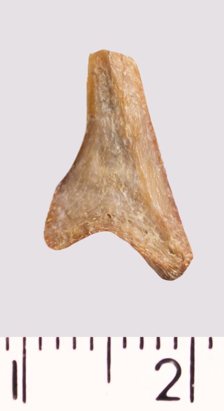 Зуб (фрагмент). Акула. Scapanorhynchus gigas Woodward 1889. Классификация: Хордовые Chordata, Позвоночные Vertebrata, Хрящевые рыбы Chondrichthyes, Пластиножаберные Elasmobranchii