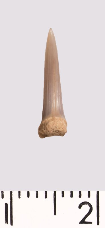 Зуб (фрагмент). Акула. Scapanorhynchus raphiodon (Agassiz, 1843). Классификация: Хордовые Chordata, Позвоночные Vertebrata, Хрящевые рыбы Chondrichthyes, Пластиножаберные Elasmobranchii, Акулы Selachii, Ламнообразные Lamniformes