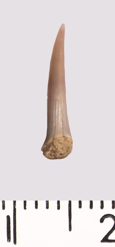 Зуб (фрагмент). Акула. Scapanorhynchus raphiodon (Agassiz, 1843). Классификация: Хордовые Chordata, Позвоночные Vertebrata, Хрящевые рыбы Chondrichthyes, Пластиножаберные Elasmobranchii, Акулы Selachii, Ламнообразные Lamniformes
