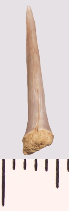 Зуб (фрагмент). Акула. Scapanorhynchus raphiodon (Agassiz, 1843). Классификация: Хордовые Chordata, Позвоночные Vertebrata, Хрящевые рыбы Chondrichthyes, Пластиножаберные Elasmobranchii, Акулы Selachii, Ламнообразные Lamniformes
