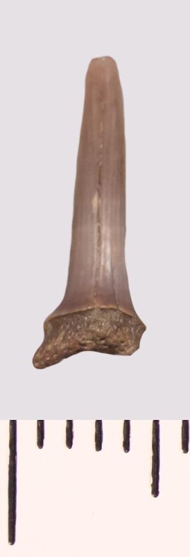 Зуб (фрагмент). Акула. Scapanorhynchus raphiodon (Agassiz, 1843). Классификация: Хордовые Chordata, Позвоночные Vertebrata, Хрящевые рыбы Chondrichthyes, Пластиножаберные Elasmobranchii, Акулы Selachii, Ламнообразные Lamniformes