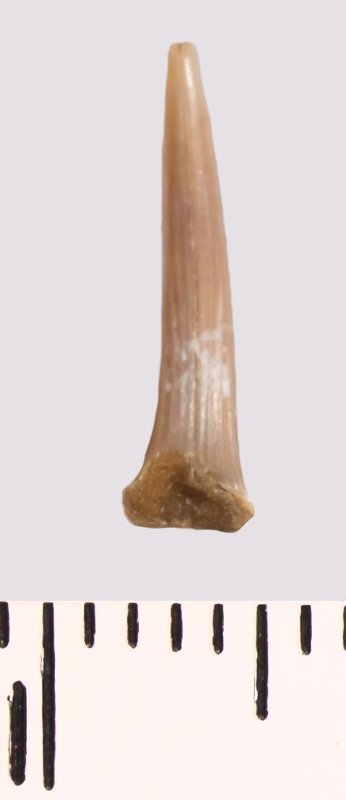 Зуб (фрагмент). Акула. Scapanorhynchus raphiodon (Agassiz, 1843). Классификация: Хордовые Chordata, Позвоночные Vertebrata, Хрящевые рыбы Chondrichthyes, Пластиножаберные Elasmobranchii, Акулы Selachii, Ламнообразные Lamniformes