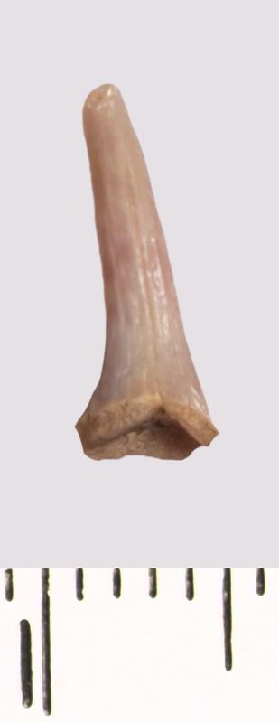 Зуб (фрагмент). Акула. Scapanorhynchus raphiodon (Agassiz, 1843). Классификация: Хордовые Chordata, Позвоночные Vertebrata, Хрящевые рыбы Chondrichthyes, Пластиножаберные Elasmobranchii, Акулы Selachii, Ламнообразные Lamniformes