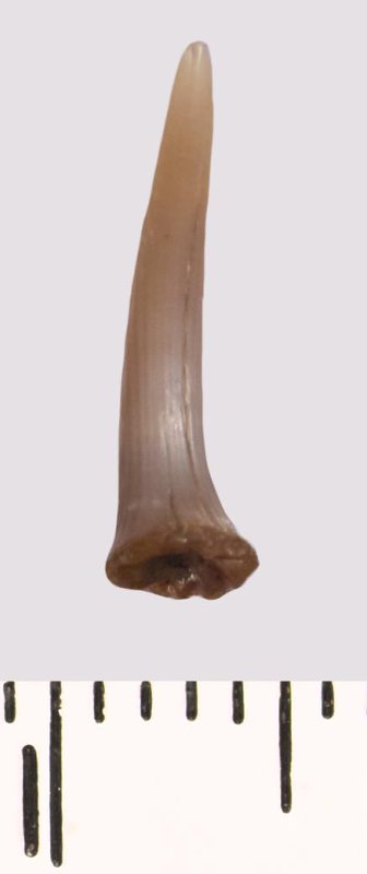 Зуб (фрагмент). Акула. Scapanorhynchus raphiodon (Agassiz, 1843). Классификация: Хордовые Chordata, Позвоночные Vertebrata, Хрящевые рыбы Chondrichthyes, Пластиножаберные Elasmobranchii, Акулы Selachii, Ламнообразные Lamniformes
