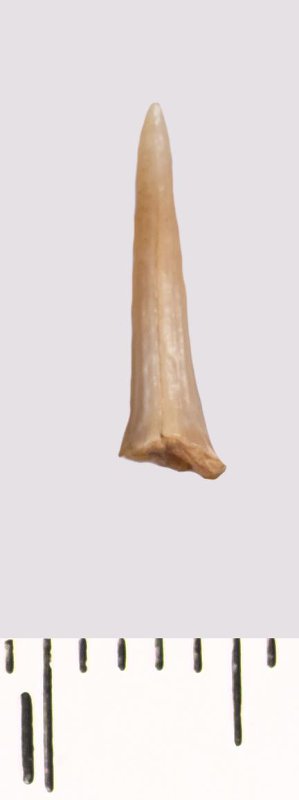 Зуб (фрагмент). Акула. Scapanorhynchus raphiodon (Agassiz, 1843). Классификация: Хордовые Chordata, Позвоночные Vertebrata, Хрящевые рыбы Chondrichthyes, Пластиножаберные Elasmobranchii, Акулы Selachii, Ламнообразные Lamniformes