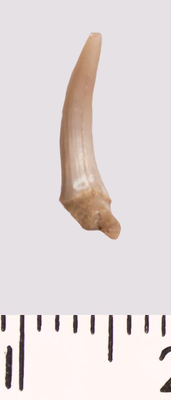 Зуб (фрагмент). Акула. Scapanorhynchus raphiodon (Agassiz, 1843). Классификация: Хордовые Chordata, Позвоночные Vertebrata, Хрящевые рыбы Chondrichthyes, Пластиножаберные Elasmobranchii, Акулы Selachii, Ламнообразные Lamniformes