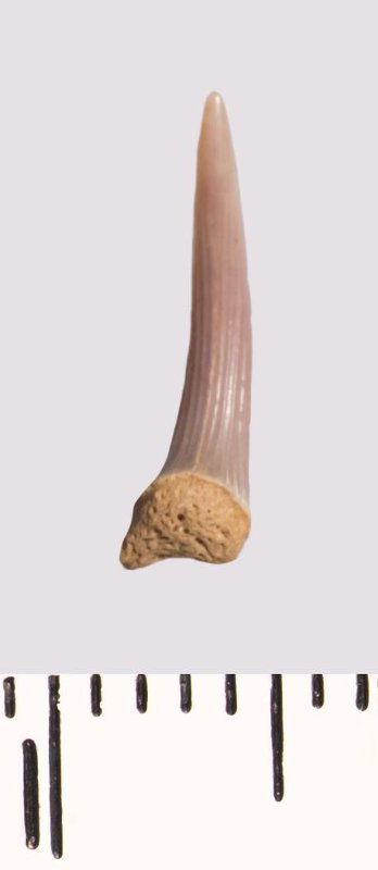 Зуб (фрагмент). Акула. Scapanorhynchus raphiodon (Agassiz, 1843). Классификация: Хордовые Chordata, Позвоночные Vertebrata, Хрящевые рыбы Chondrichthyes, Пластиножаберные Elasmobranchii, Акулы Selachii, Ламнообразные Lamniformes