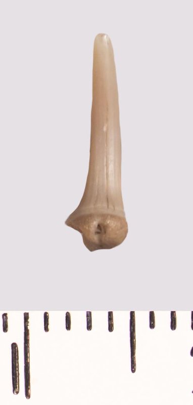 Зуб (фрагмент). Акула. Scapanorhynchus raphiodon (Agassiz, 1843). Классификация: Хордовые Chordata, Позвоночные Vertebrata, Хрящевые рыбы Chondrichthyes, Пластиножаберные Elasmobranchii, Акулы Selachii, Ламнообразные Lamniformes