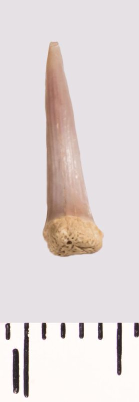 Зуб (фрагмент). Акула. Scapanorhynchus raphiodon (Agassiz, 1843). Классификация: Хордовые Chordata, Позвоночные Vertebrata, Хрящевые рыбы Chondrichthyes, Пластиножаберные Elasmobranchii, Акулы Selachii, Ламнообразные Lamniformes