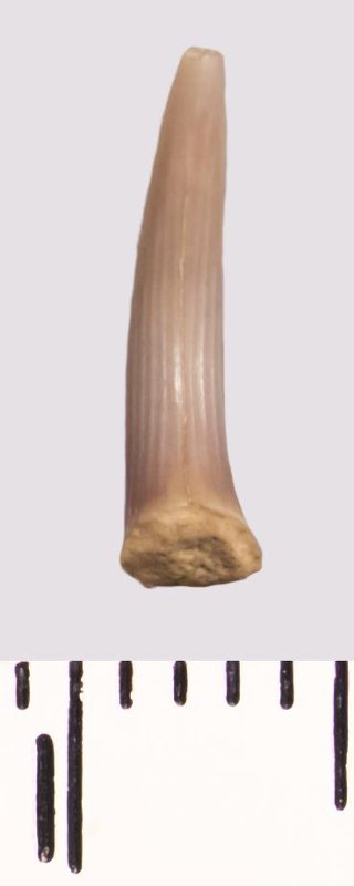 Зуб (фрагмент). Акула. Scapanorhynchus raphiodon (Agassiz, 1843). Классификация: Хордовые Chordata, Позвоночные Vertebrata, Хрящевые рыбы Chondrichthyes, Пластиножаберные Elasmobranchii, Акулы Selachii, Ламнообразные Lamniformes