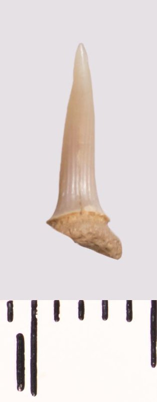 Зуб (фрагмент). Акула. Scapanorhynchus raphiodon (Agassiz, 1843). Классификация: Хордовые Chordata, Позвоночные Vertebrata, Хрящевые рыбы Chondrichthyes, Пластиножаберные Elasmobranchii, Акулы Selachii, Ламнообразные Lamniformes