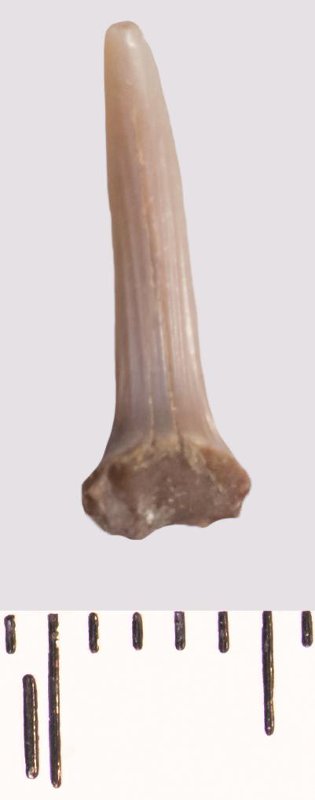 Зуб (фрагмент). Акула. Scapanorhynchus raphiodon (Agassiz, 1843). Классификация: Хордовые Chordata, Позвоночные Vertebrata, Хрящевые рыбы Chondrichthyes, Пластиножаберные Elasmobranchii, Акулы Selachii, Ламнообразные Lamniformes