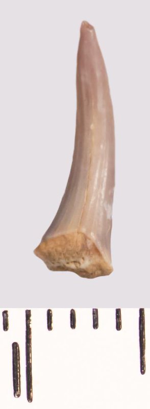 Зуб (фрагмент). Акула. Scapanorhynchus raphiodon (Agassiz, 1843). Классификация: Хордовые Chordata, Позвоночные Vertebrata, Хрящевые рыбы Chondrichthyes, Пластиножаберные Elasmobranchii, Акулы Selachii, Ламнообразные Lamniformes