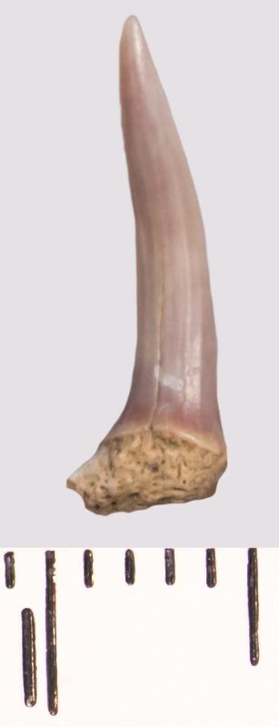 Зуб (фрагмент). Акула. Scapanorhynchus raphiodon (Agassiz, 1843). Классификация: Хордовые Chordata, Позвоночные Vertebrata, Хрящевые рыбы Chondrichthyes, Пластиножаберные Elasmobranchii, Акулы Selachii, Ламнообразные Lamniformes
