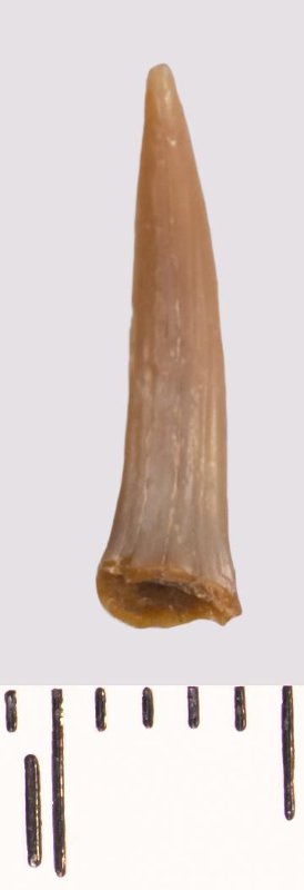 Зуб (фрагмент). Акула. Scapanorhynchus raphiodon (Agassiz, 1843). Классификация: Хордовые Chordata, Позвоночные Vertebrata, Хрящевые рыбы Chondrichthyes, Пластиножаберные Elasmobranchii, Акулы Selachii, Ламнообразные Lamniformes