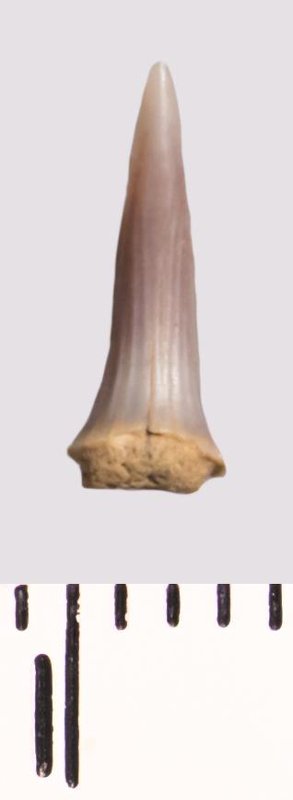 Зуб (фрагмент). Акула. Scapanorhynchus raphiodon (Agassiz, 1843). Классификация: Хордовые Chordata, Позвоночные Vertebrata, Хрящевые рыбы Chondrichthyes, Пластиножаберные Elasmobranchii, Акулы Selachii, Ламнообразные Lamniformes