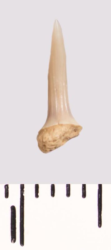 Зуб (фрагмент). Акула. Scapanorhynchus raphiodon (Agassiz, 1843). Классификация: Хордовые Chordata, Позвоночные Vertebrata, Хрящевые рыбы Chondrichthyes, Пластиножаберные Elasmobranchii, Акулы Selachii, Ламнообразные Lamniformes