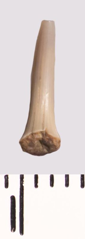Зуб (фрагмент). Акула. Scapanorhynchus raphiodon (Agassiz, 1843). Классификация: Хордовые Chordata, Позвоночные Vertebrata, Хрящевые рыбы Chondrichthyes, Пластиножаберные Elasmobranchii, Акулы Selachii, Ламнообразные Lamniformes