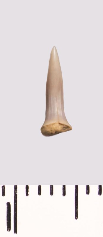 Зуб (фрагмент). Акула. Scapanorhynchus raphiodon (Agassiz, 1843). Классификация: Хордовые Chordata, Позвоночные Vertebrata, Хрящевые рыбы Chondrichthyes, Пластиножаберные Elasmobranchii, Акулы Selachii, Ламнообразные Lamniformes