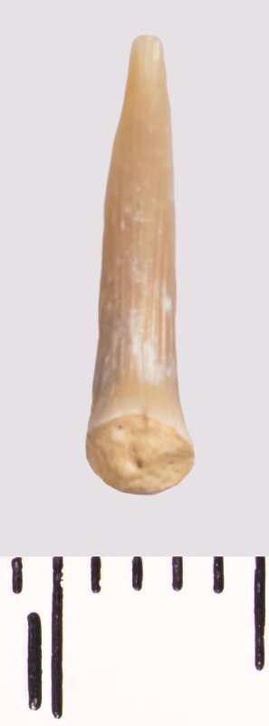 Зуб (фрагмент). Акула. Scapanorhynchus raphiodon (Agassiz, 1843). Классификация: Хордовые Chordata, Позвоночные Vertebrata, Хрящевые рыбы Chondrichthyes, Пластиножаберные Elasmobranchii, Акулы Selachii, Ламнообразные Lamniformes