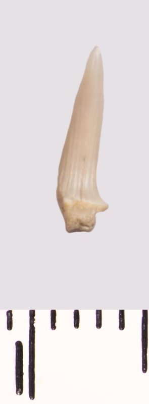 Зуб (фрагмент). Акула. Scapanorhynchus raphiodon (Agassiz, 1843). Классификация: Хордовые Chordata, Позвоночные Vertebrata, Хрящевые рыбы Chondrichthyes, Пластиножаберные Elasmobranchii, Акулы Selachii, Ламнообразные Lamniformes
