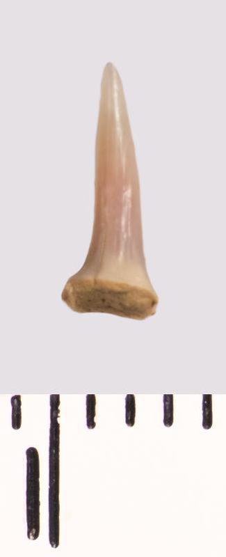 Зуб (фрагмент). Акула. Scapanorhynchus raphiodon (Agassiz, 1843). Классификация: Хордовые Chordata, Позвоночные Vertebrata, Хрящевые рыбы Chondrichthyes, Пластиножаберные Elasmobranchii, Акулы Selachii, Ламнообразные Lamniformes