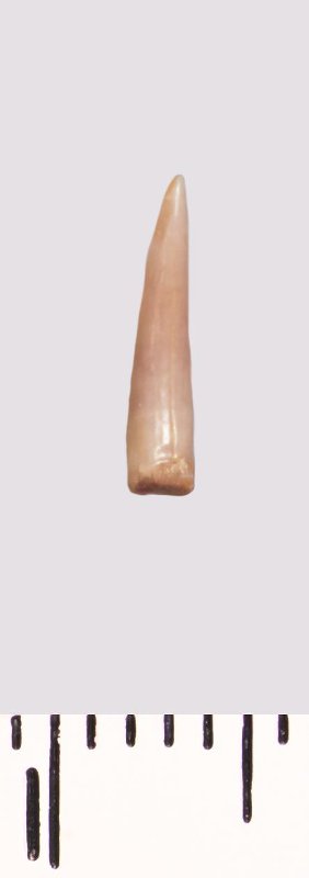 Зуб (фрагмент). Акула. Scapanorhynchus raphiodon (Agassiz, 1843). Классификация: Хордовые Chordata, Позвоночные Vertebrata, Хрящевые рыбы Chondrichthyes, Пластиножаберные Elasmobranchii, Акулы Selachii, Ламнообразные Lamniformes