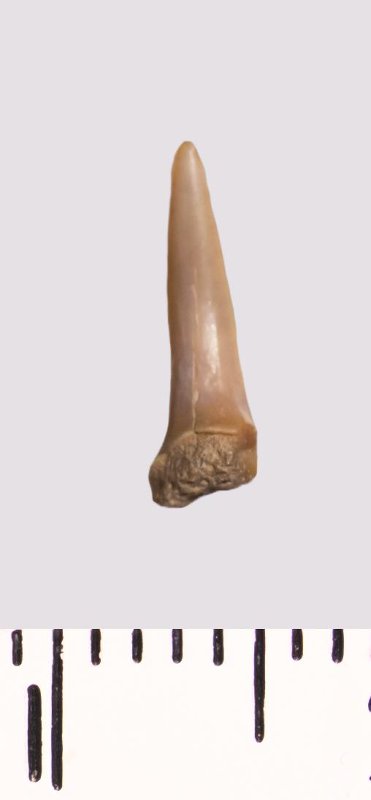 Зуб (фрагмент). Акула. Scapanorhynchus raphiodon (Agassiz, 1843). Классификация: Хордовые Chordata, Позвоночные Vertebrata, Хрящевые рыбы Chondrichthyes, Пластиножаберные Elasmobranchii, Акулы Selachii, Ламнообразные Lamniformes