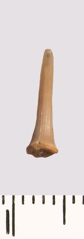 Зуб (фрагмент). Акула. Scapanorhynchus raphiodon (Agassiz, 1843). Классификация: Хордовые Chordata, Позвоночные Vertebrata, Хрящевые рыбы Chondrichthyes, Пластиножаберные Elasmobranchii, Акулы Selachii, Ламнообразные Lamniformes