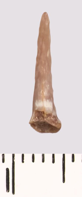 Зуб (фрагмент). Акула. Scapanorhynchus raphiodon (Agassiz, 1843). Классификация: Хордовые Chordata, Позвоночные Vertebrata, Хрящевые рыбы Chondrichthyes, Пластиножаберные Elasmobranchii, Акулы Selachii, Ламнообразные Lamniformes
