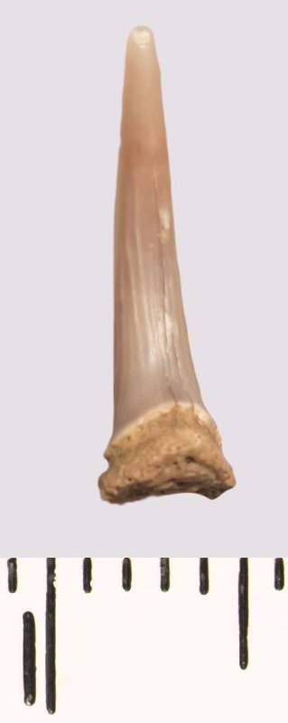 Зуб (фрагмент). Акула. Scapanorhynchus raphiodon (Agassiz, 1843). Классификация: Хордовые Chordata, Позвоночные Vertebrata, Хрящевые рыбы Chondrichthyes, Пластиножаберные Elasmobranchii, Акулы Selachii, Ламнообразные Lamniformes