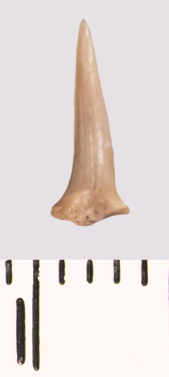 Зуб (фрагмент). Акула. Scapanorhynchus raphiodon (Agassiz, 1843). Классификация: Хордовые Chordata, Позвоночные Vertebrata, Хрящевые рыбы Chondrichthyes, Пластиножаберные Elasmobranchii, Акулы Selachii, Ламнообразные Lamniformes
