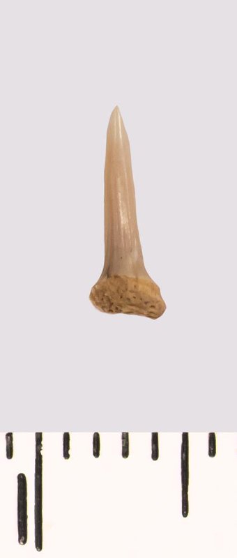Зуб (фрагмент). Акула. Scapanorhynchus raphiodon (Agassiz, 1843). Классификация: Хордовые Chordata, Позвоночные Vertebrata, Хрящевые рыбы Chondrichthyes, Пластиножаберные Elasmobranchii, Акулы Selachii, Ламнообразные Lamniformes