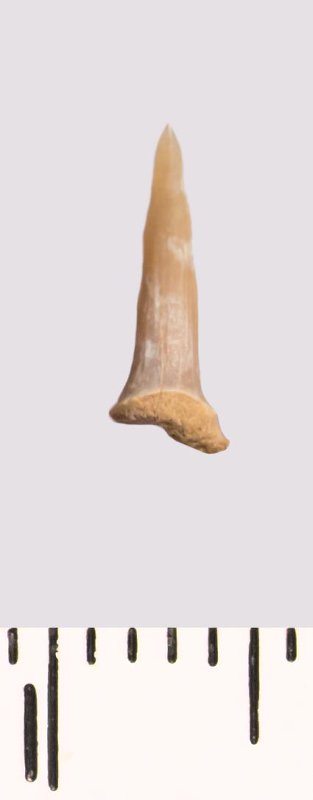 Зуб (фрагмент). Акула. Scapanorhynchus raphiodon (Agassiz, 1843). Классификация: Хордовые Chordata, Позвоночные Vertebrata, Хрящевые рыбы Chondrichthyes, Пластиножаберные Elasmobranchii, Акулы Selachii, Ламнообразные Lamniformes