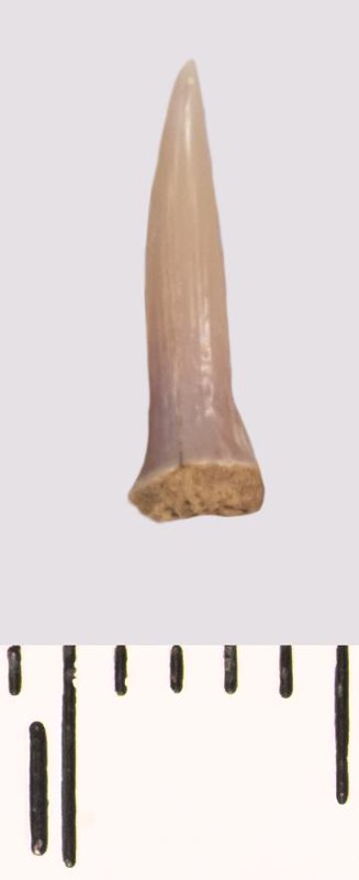 Зуб (фрагмент). Акула. Scapanorhynchus raphiodon (Agassiz, 1843). Классификация: Хордовые Chordata, Позвоночные Vertebrata, Хрящевые рыбы Chondrichthyes, Пластиножаберные Elasmobranchii, Акулы Selachii, Ламнообразные Lamniformes