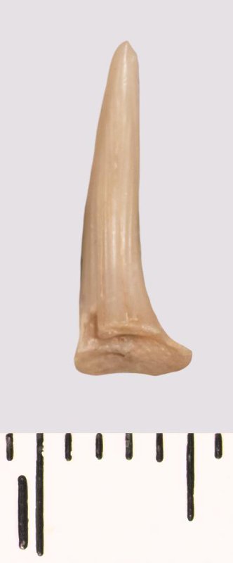 Зуб (фрагмент). Акула. Scapanorhynchus raphiodon (Agassiz, 1843). Классификация: Хордовые Chordata, Позвоночные Vertebrata, Хрящевые рыбы Chondrichthyes, Пластиножаберные Elasmobranchii, Акулы Selachii, Ламнообразные Lamniformes